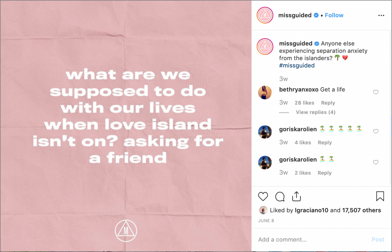 Missguided es una marca de Instagram que está muy en sintonía con su audiencia demográfica.