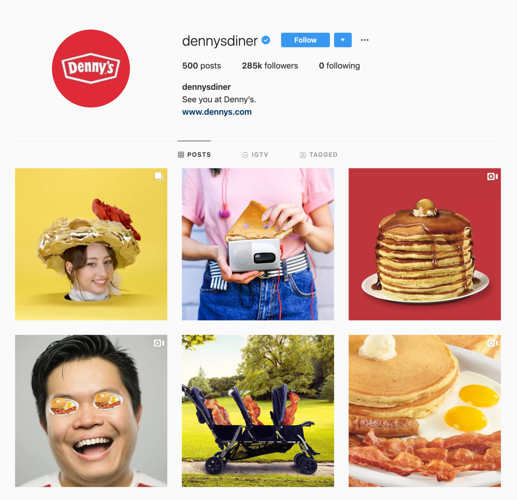 Denny»s conoce la estética y la personalidad de su marca. Debido a que Denny»s es una cadena de restaurantes, utilizan la comida para convertirla en una estética divertida, brillante, atrevida y artística. Su contenido por lo general tiene un tema en él y se centra en cómo su comida puede ser utilizada de una manera estrafalaria. Mira ese sombrero de crepe.
