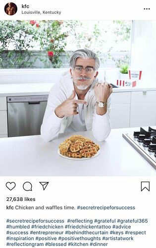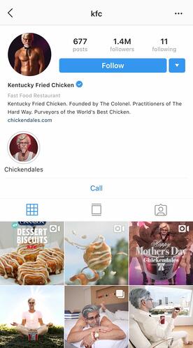 KFC ha construido su marca en torno al Coronel Sanders. A lo largo de los años, han utilizado el marketing de influencia de Instagram al hacer que diferentes celebridades retraten al Coronel, pintándose a sí mismos como una marca divertida y humorística para el público. El emparejamiento con celebridades o personas influyentes es una de las maneras más efectivas de conseguir que su contenido sea visto por una audiencia más amplia.