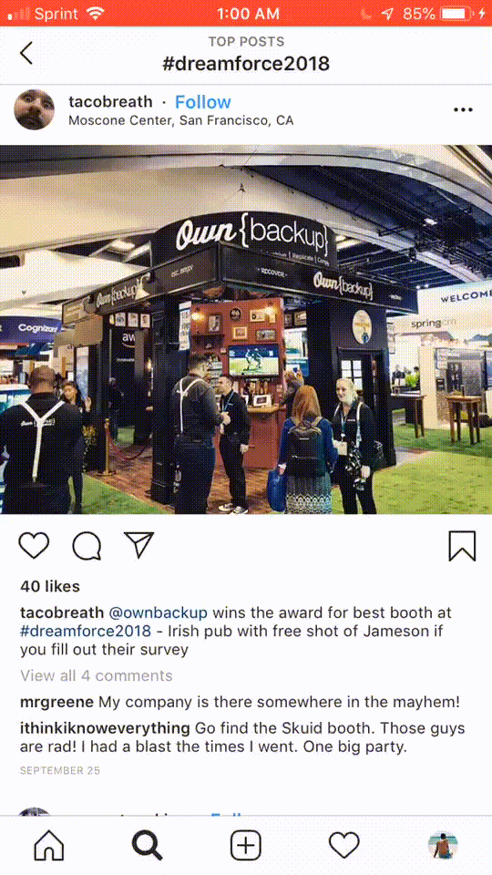 Después de buscar más del hashtag #Dreamforce2018, vi una foto del stand de OwnBackup, con una descripción que prometía una toma gratis de Jameson para rellenar su encuesta. Definitivamente quería asegurarme de encontrar ese puesto más tarde.