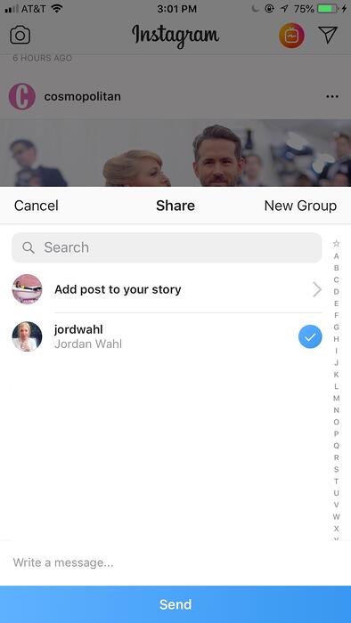 Cuando toque la imagen del avión de papel debajo de la imagen que desea compartir, Instagram le mostrará una lista de sus conversaciones existentes. Si no ve a sus destinatarios, simplemente utilice la barra de búsqueda para encontrar su cuenta y seleccione su manejo Instagram de la lista.