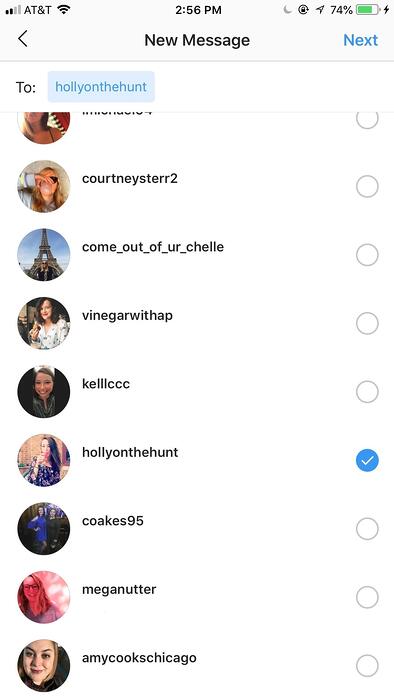 Instagram mostrará una lista de cuentas sugeridas a las que puede enviar su mensaje directo. Si no ve al destinatario deseado, utilice la barra de búsqueda situada en la parte superior de la pantalla para buscarlo, ya sea por su nombre de usuario o por su nombre completo. Cuando haya seleccionado su destinatario, haga clic en «Siguiente» en la esquina superior derecha.