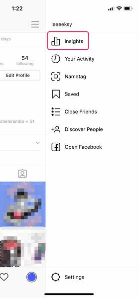 Al hacer clic en the≣button en la esquina superior derecha de su perfil Instagram, la barra lateral aparecerá a la derecha. Haga clic enInsights.